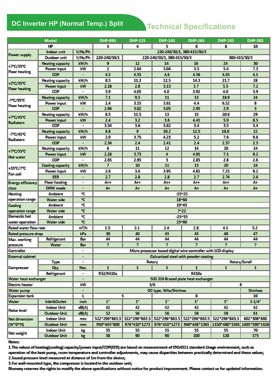 Blueway DC Inverter Heat Pump has normal ambient & low ambient type, including split & monoblock type, R32 or R410a is optional, which can provide air conditioning, heating and hot water for families, apartments, small industrial sites, etc. Its core philosophy is to solve users’ house heating during winter and cooling during summer, as well as domestic hot water. Additionally, it can work with solar, boiler or electric heater according to the practical condition of the heating system. For low ambient type, it can stably work under ambient temperature down -35℃. Some models have gotten ErP A++ from TUV.